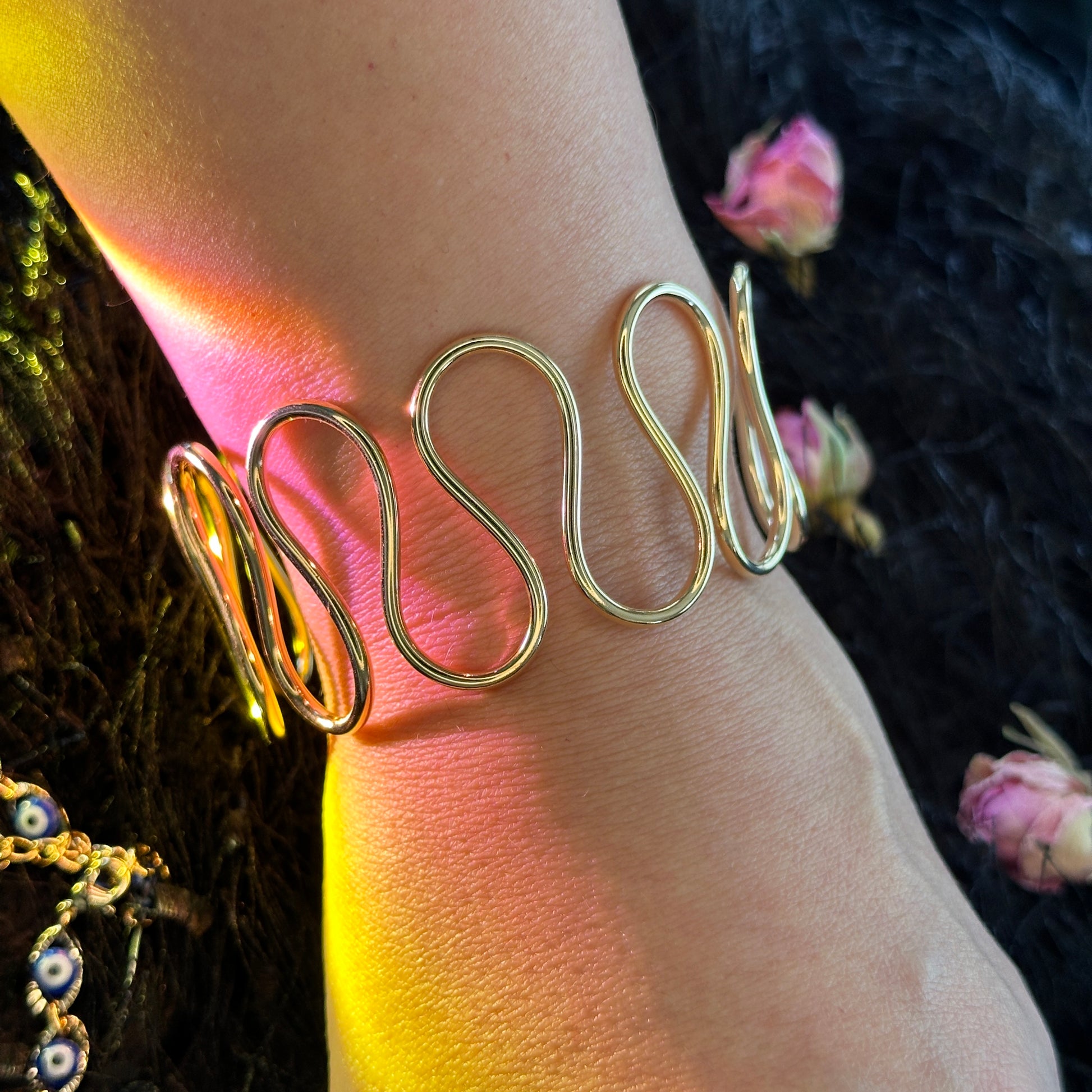 A coiled bracelet cuff shaped like a continuous wave, Mauj holds the knowing that endings are never final—only folded into new beginnings. It wraps the wrist in rhythm and reminds the body to trust cycles.