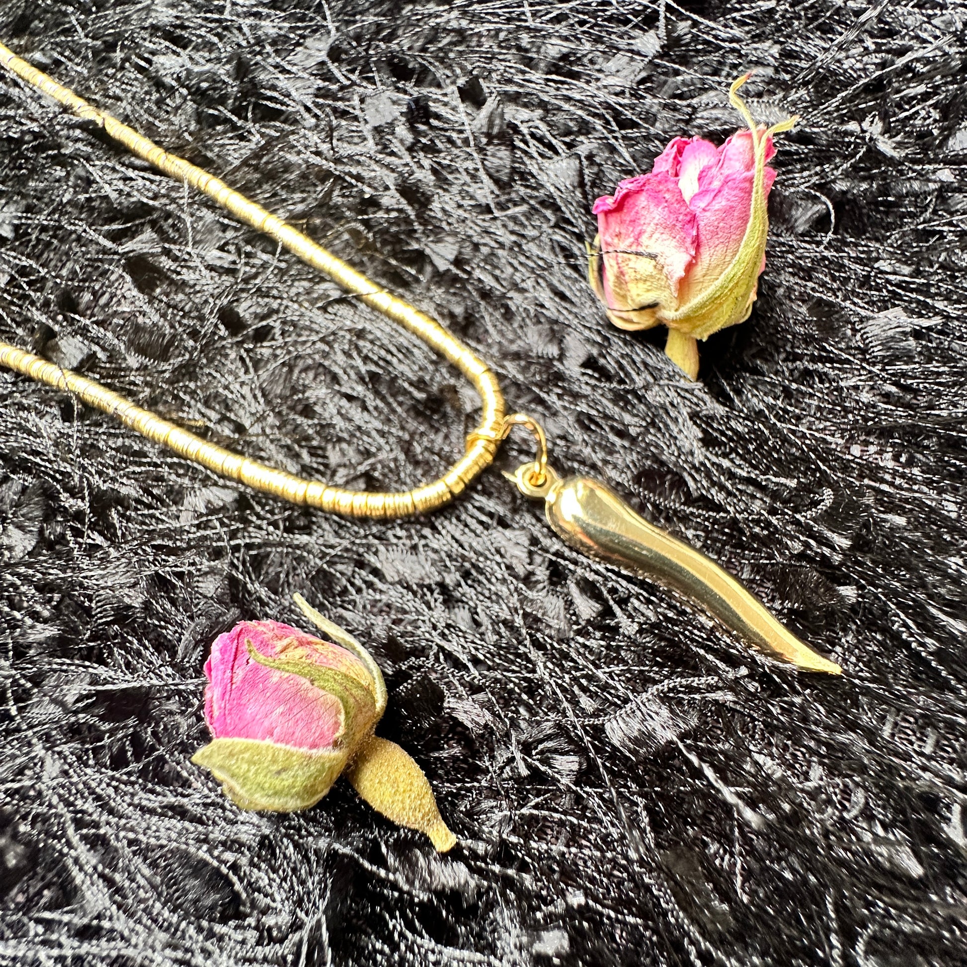The Mirchi pendant carries heat with heart. Shaped like a chili and traced with a subtle heart ring, this piece draws from ancestral symbolism—where mirchi is worn for protection, vitality, and warding off the evil eye, while the heart reminds us that desire and care can coexist. It’s a talisman for those who live boldly but love with intention—who know that fire, when held with care, becomes light.