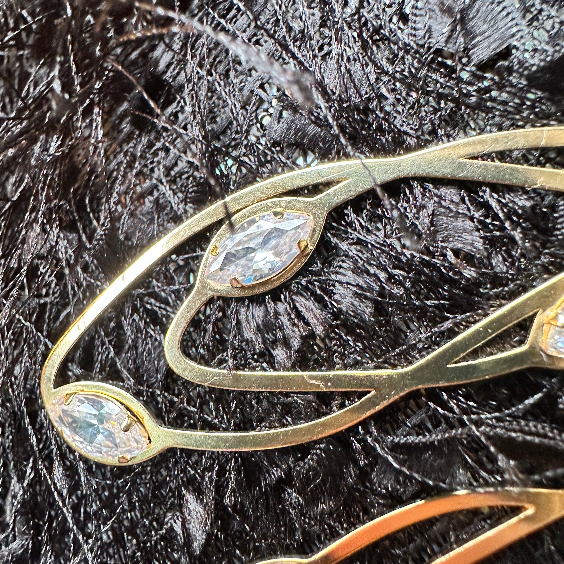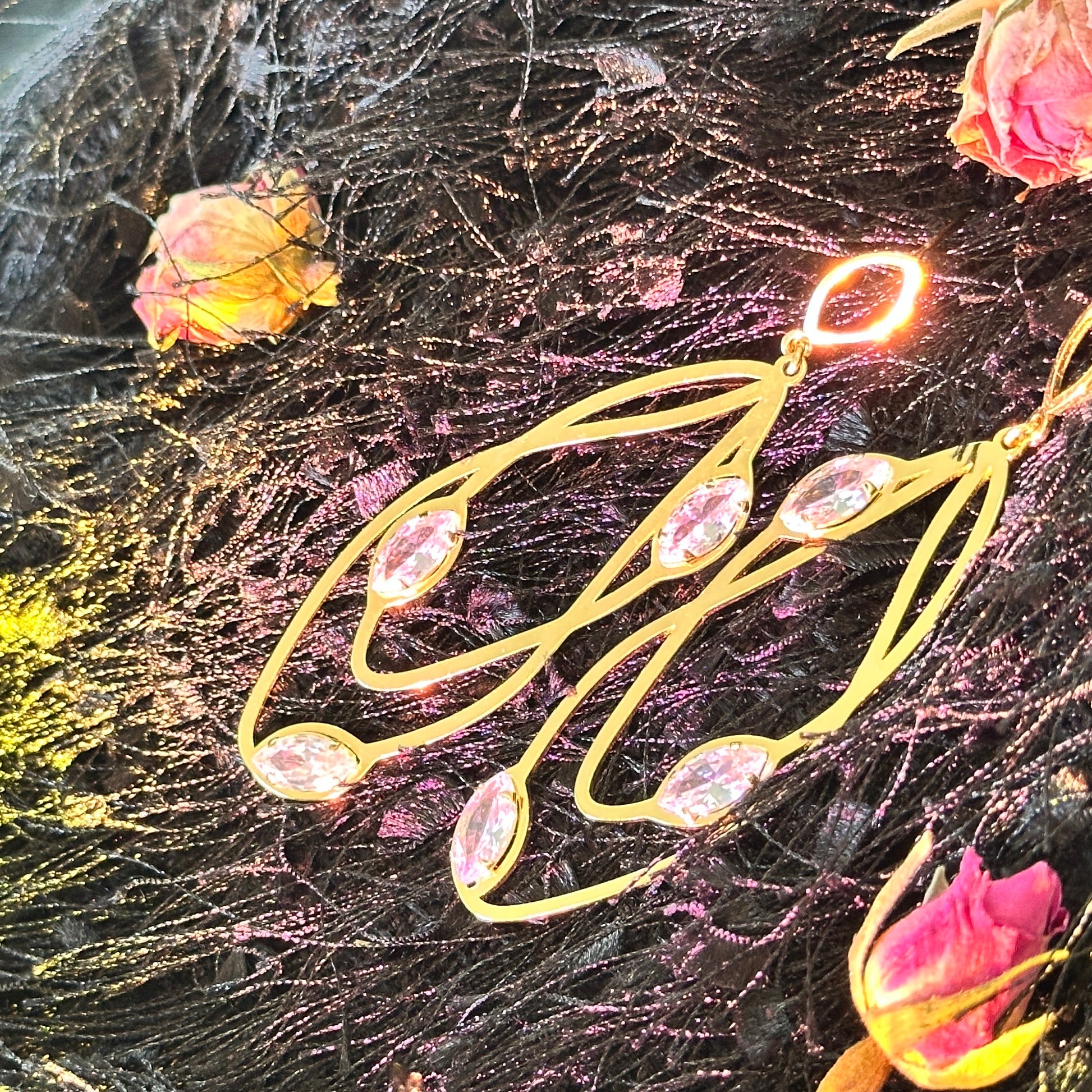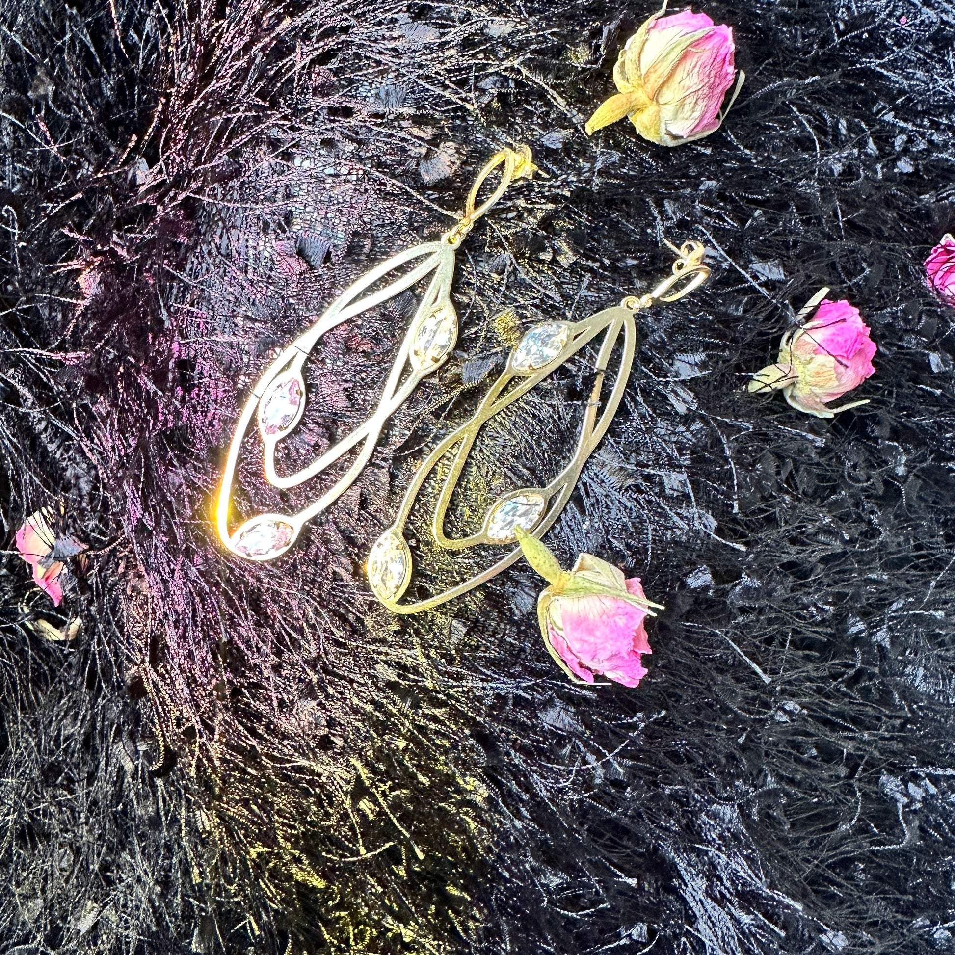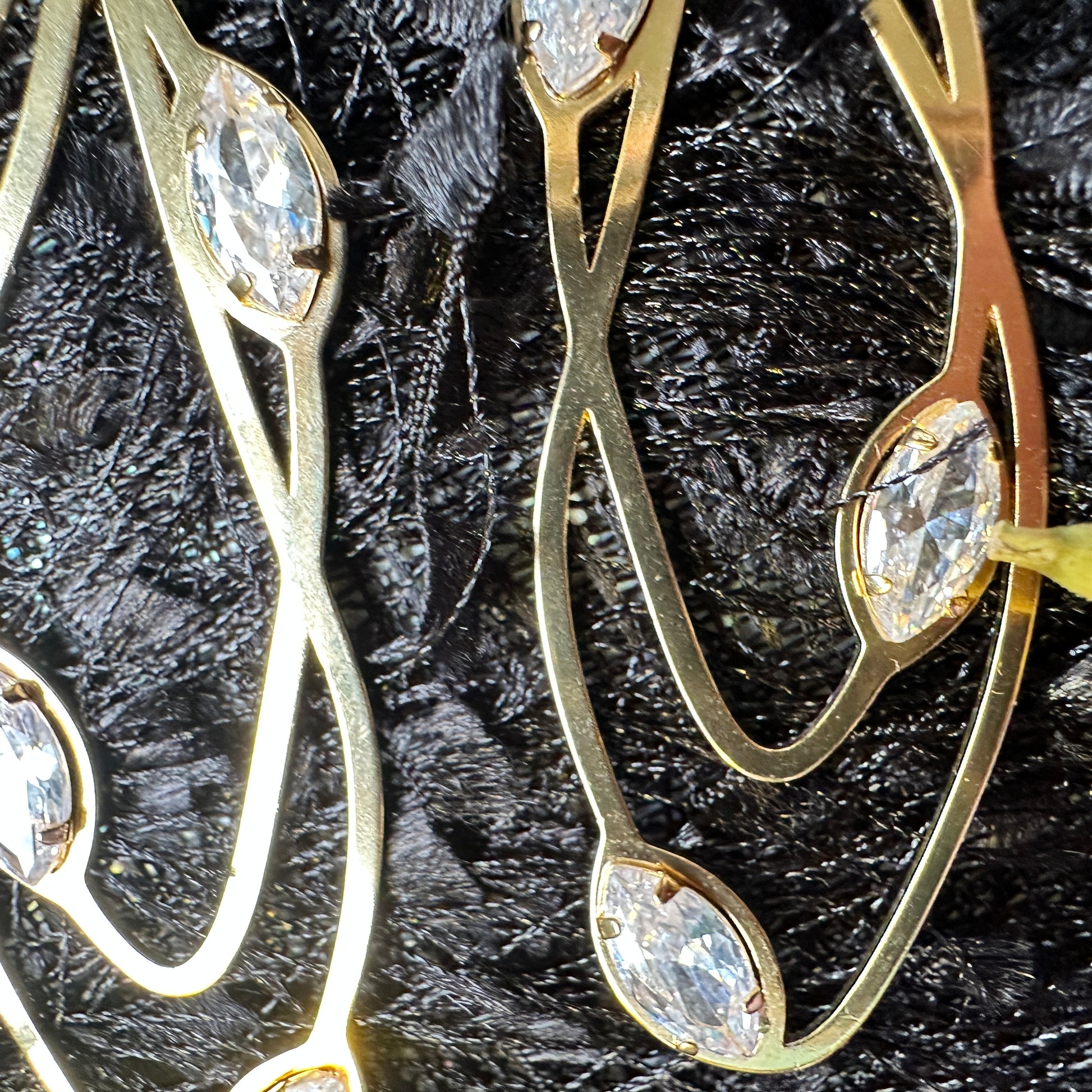 Qandeel—named for light that guides and dazzles. These abstract chandelier earrings trace an elegant oval form, set with softly sparkling stones that catch light with movement. Sculptural yet fluid, Qandeel is designed to illuminate—not overpower—bringing quiet spectacle to elevate your look. Lightweight despite their length, they move with you, elongating the line of the neck. Wear them when you want to feel luminous, grounded, and unmistakably yourself.
